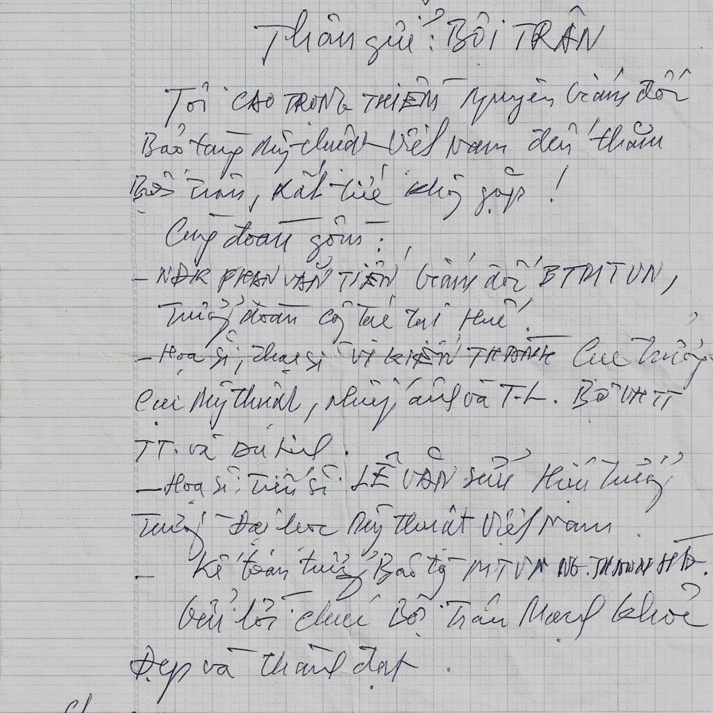 A handwritten letter of the former Director of Vietnam National Fine Arts Museum (1998-2003) to Boi Tran (Vietnam, B. 1957) “Hue, 14 November 2013 Dear BOI TRAN I, CAO TRONG THIEM, former Director of Vietnam National Fine Arts Museum (1998-2003), came to see you but, unfortunately, failed to meet you! Accompanied by: – Mr PHAN VAN TIEN, Director of Vietnam National Fine Arts Museum, leader …