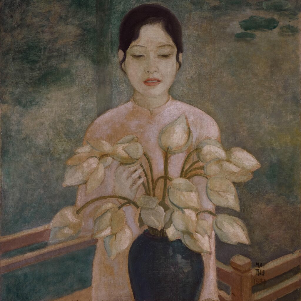 Mai Trung Thu (Vietnam, 1906-1980) La Jeune Fille de Hué signed and dated ‘MAI THU 1937’ (lower right) oil on canvas 75 x 70 cm. (29 1/2 x 27 1/2 in.) Painted in 1937 Love is always a multitude of emotions. To think it, takes courage, to know it, requires experience and to paint it, demands talent. In Hue, 1937, Mai Thu painted this magnificent …